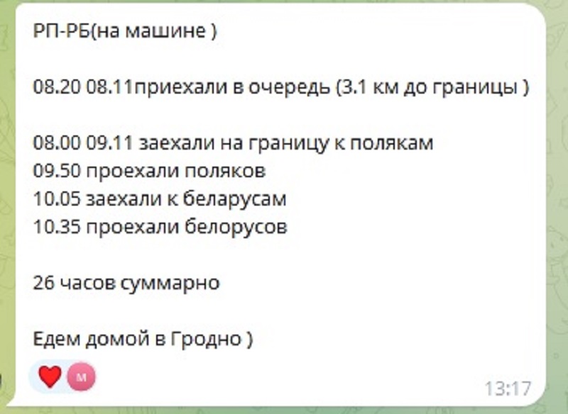 Спустя 3 часа к нам приехал страж граничный и начал нам помогать! Стоял на кольце и следил, чтобы заезжали только люди из очереди, а не литовцы на транзитных номерах и брестчане. И очередь сразу же начала двигаться!», — рассказала Юлия.