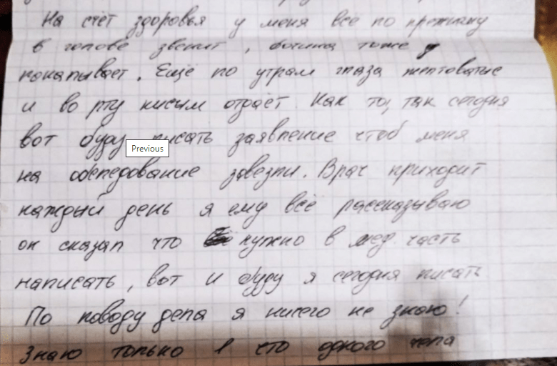 Одним из аргументов, на которые ссылается сестра заключенного, стало письмо Вячеслава из следственного изолятора, где он сообщает о состоянии своего здоровья.