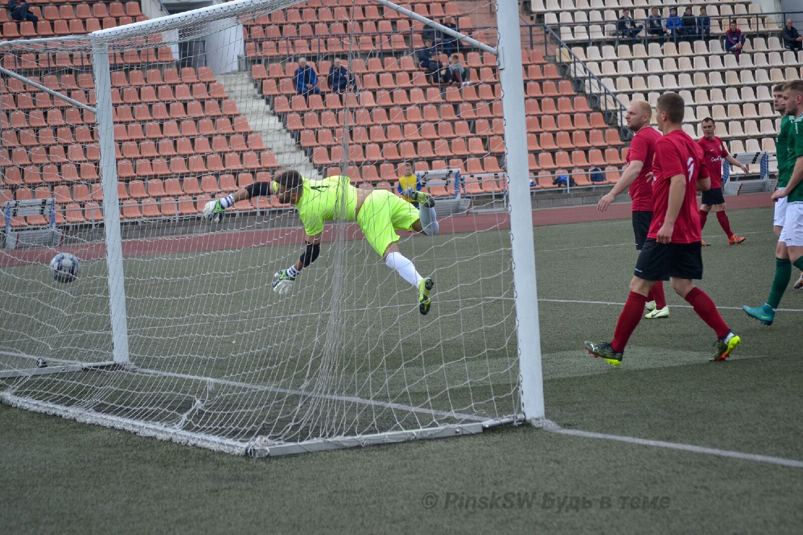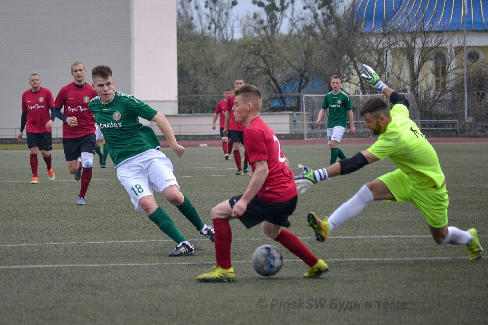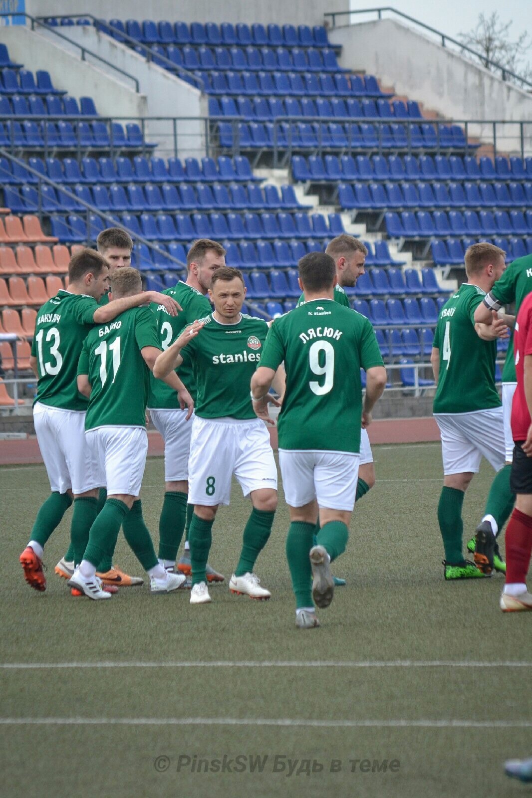 После чего игра прекратилась. Гости из-за нехватки мастерства много ошибались, однажды ударили выше ворот. «Стэнлес» много владел мячом. Казалось, что уже они пытались завести мяч в ворота. Ничего не получалось в нападении у опытного Андрея Лясюка. Часто теряли мяч и пинчане. Мог забивать Олег Курган, но после удара головой мяч угодил в штангу. На перерыв игроки хозяев уходили взвинченные и злые.