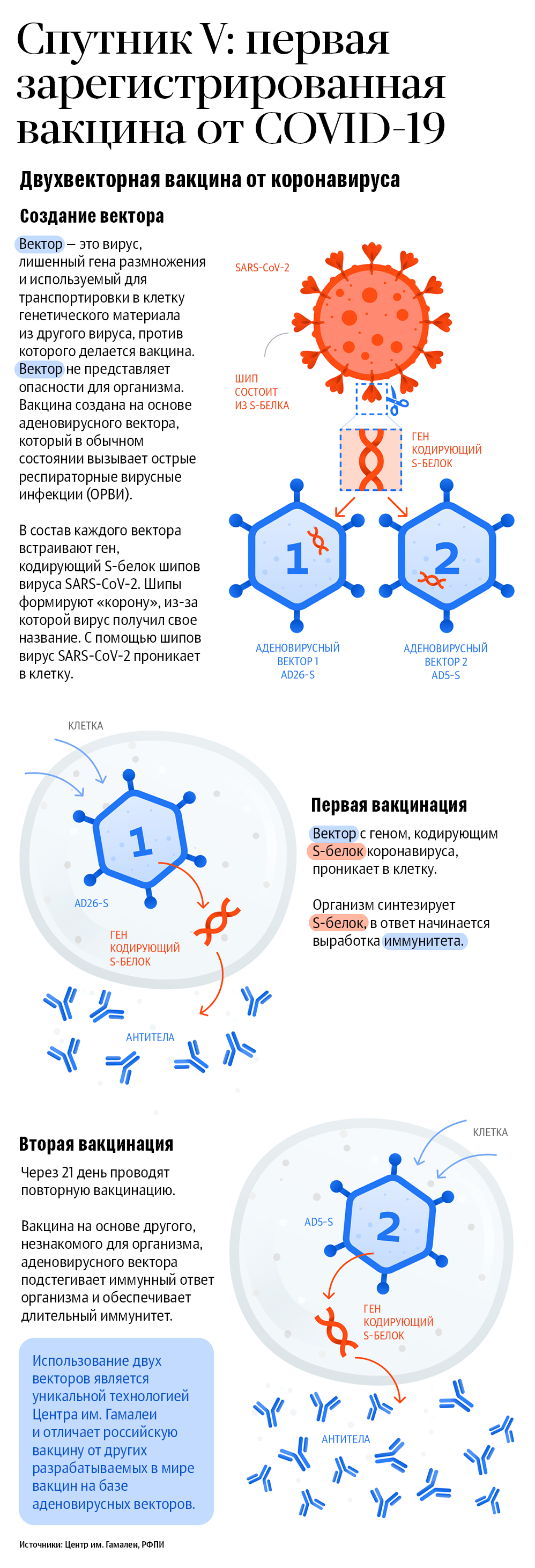 Вакцина «Спутник V» разработана Министерством обороны РФ и Национальным исследовательским центром эпидемиологии и микробиологии имени Н. Ф. Гамалеи.