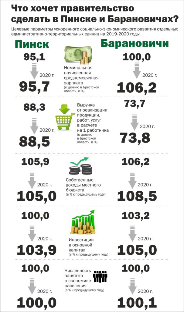 Так, для Барановичей средняя зарплата в 2019 году должна оказаться на уровне 100% к той, что будет в целом по Брестской области, а в 2020 году – 106,2%. Для Пинска этот прогноз составляет 95,1% (по 2019 году) и 95,7% (2020 год). В обоих городах Брестчины власти намерены удержать численность занятого в экономике населения на прежнем уровне.