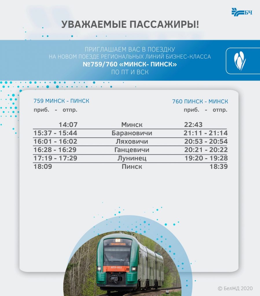 Как сообщает пресс-служба БелЖД, с 13 декабря начинает курсировать поезд региональных линий бизнес-класса Минск - Пинск по пятницам и воскресеньям.
