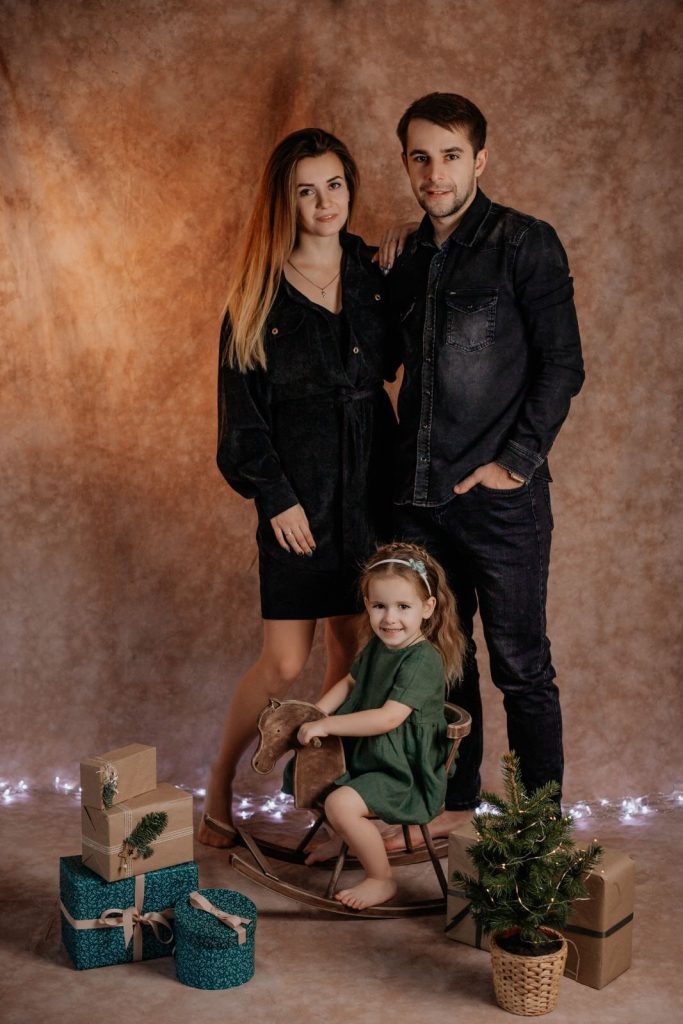 Фото из той же новогодней коллекции. Здесь Олег в той же чёрной джинсовой рубашке и джинсах тех же тонов. Вторая половинка одета соответствующе. Чёрный халат с минимализмом в нем лишь придаёт образу уютности и теплоты. Образ любим для Олега Вакулича, ведь он ассоциируется с семьей и добротой.