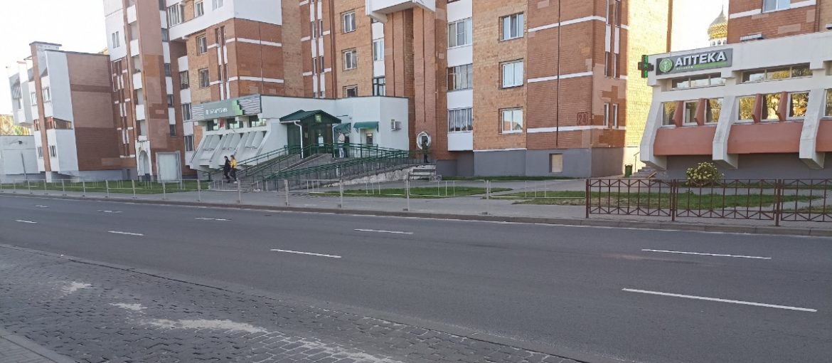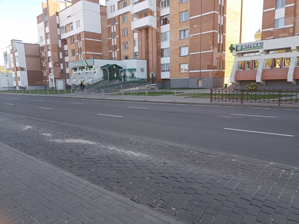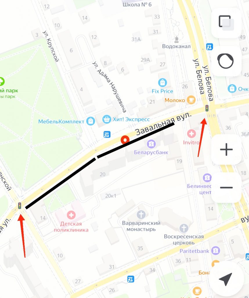 Светофоры здесь расположены достаточно далеко по обе стороны от места ДТП. Забор на этом участке дороги есть, но не по всему периметру. Его не было как раз возле Беларусбанка и аптеки, где и произошла авария.