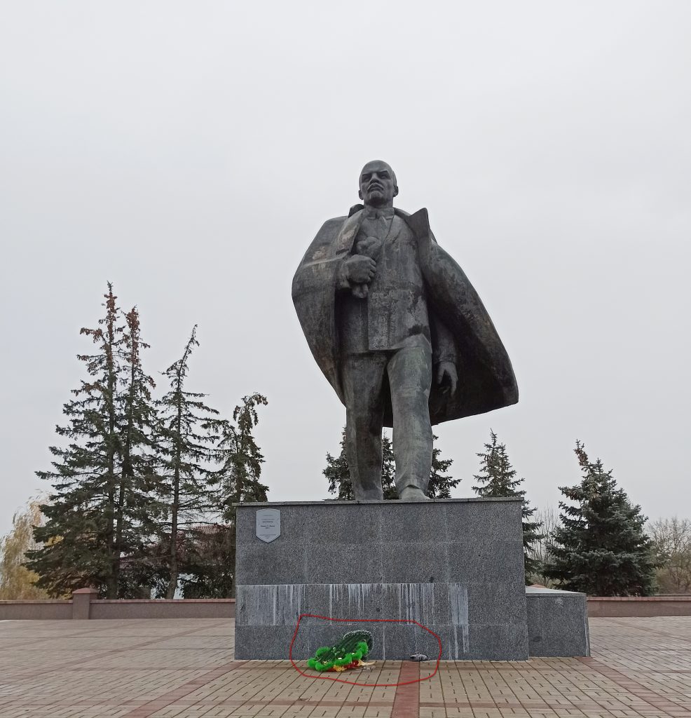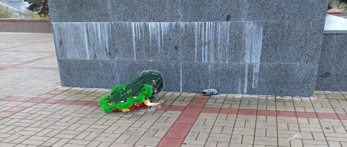 На фото у подножия памятника лежит опрокинутый венок, который возлагали 7 ноября. Кроме того, рядом с ним вверх ногами лежит мертвый голубь.
