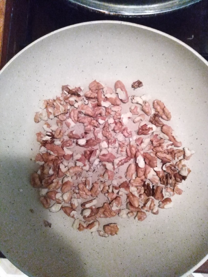 Почистить орехи и промыть их. Обжарить на сковороде без подсолнечного масла около 10 минут. По желанию орехи можно измельчить.