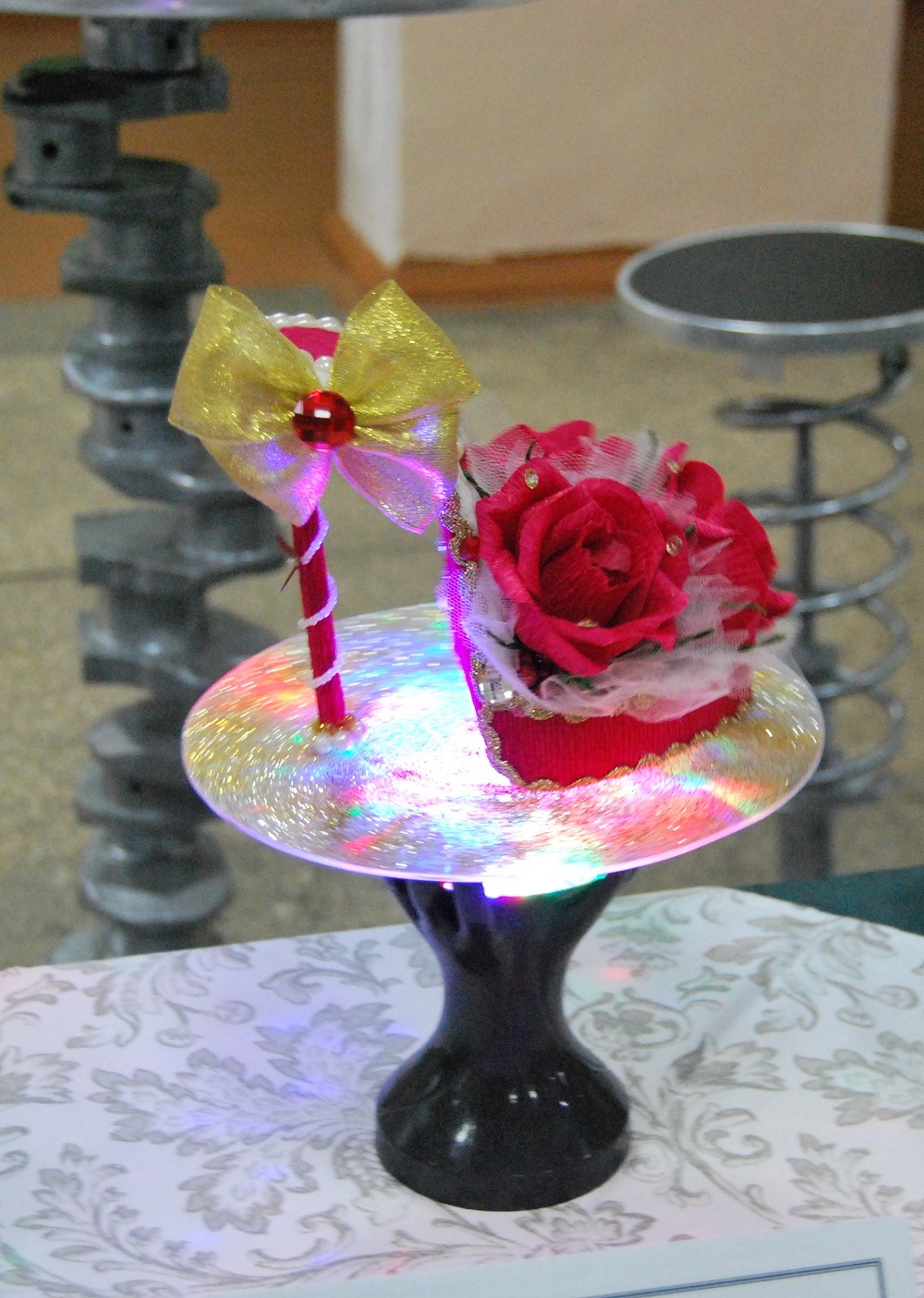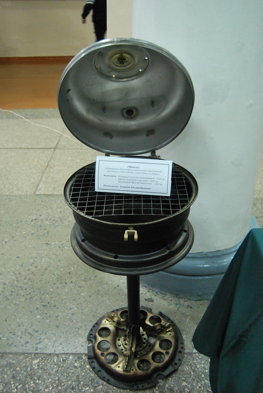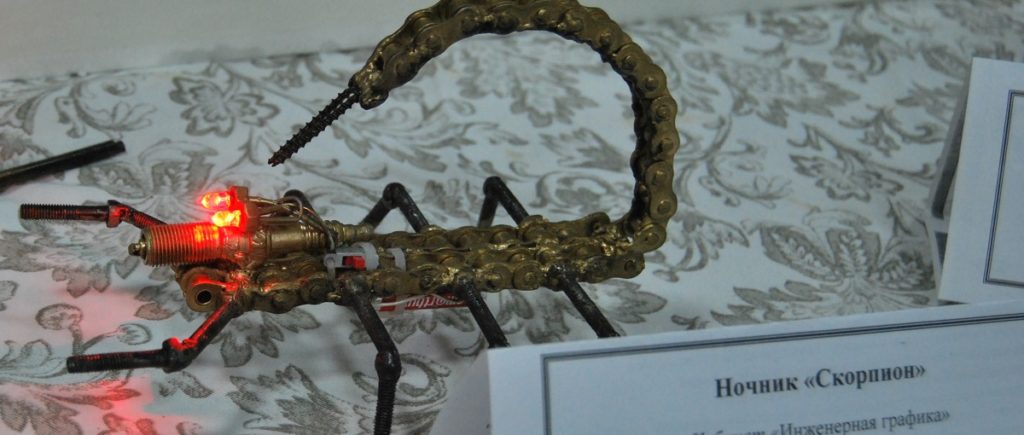 Скорпион из запчастей и цепей, экскаватор из деталей конструктора Лего, мангал-коптилка из автомобильного диска, букет цветов из салфеток и декоративный бумаги.