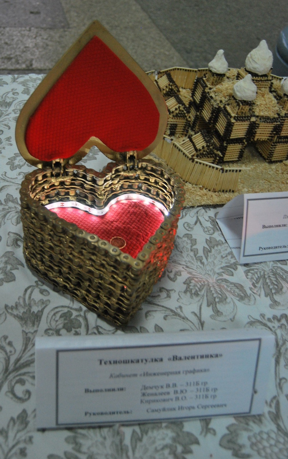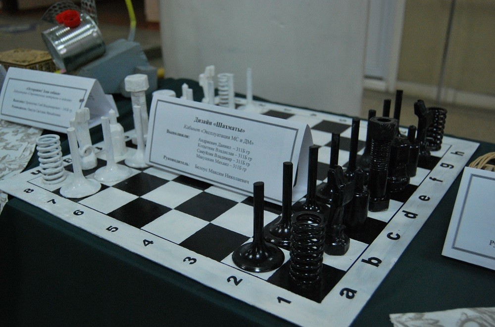 Разнообразие идей и широкий выбор материалов. Здесь нашлось применение отходам металла и старым деталям, шахматные фигуры из пружин и клапанов двигателя, городок из спичек, символ Лондона из картона.