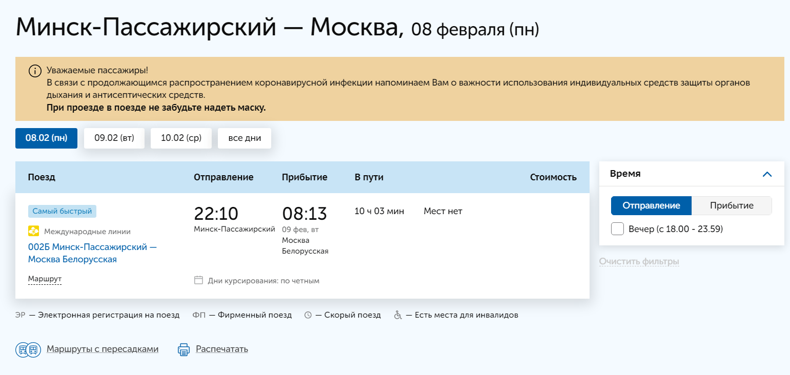 На первом этапе начнет курсировать поезд № 2/1 Минск–Москва, из Минска он отправится уже 8 февраля, но мест, как показывает система предварительной продажи билетов уже нет: