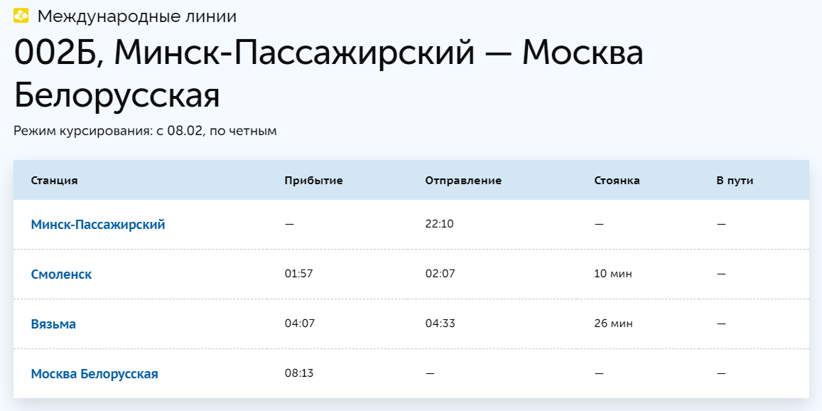 — Из Минска поезд № 2/1 Минск–Москва будет отправляться в 22:10 и прибывать в Москву в 08:13. Из Москвы поезд отправится в 22:13 и прибудет в Минск в 07:26, — сообщает пресс-служба БелЖД.