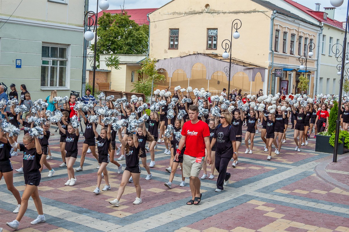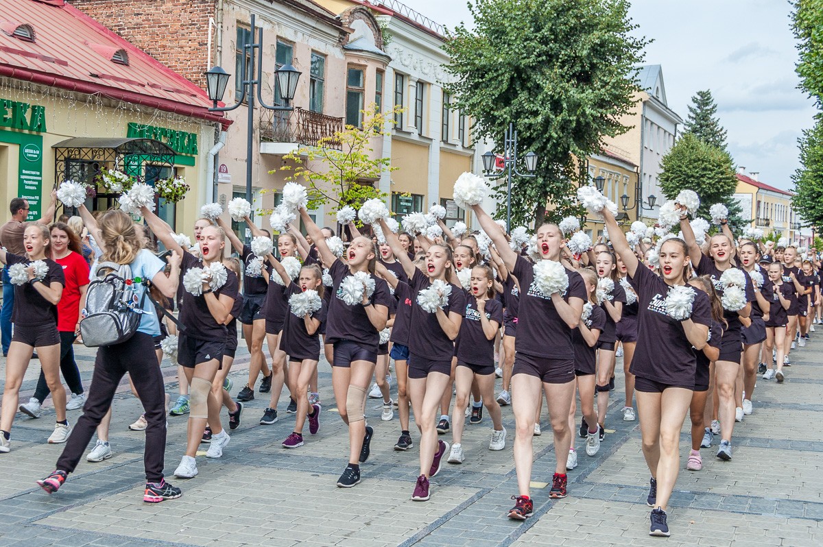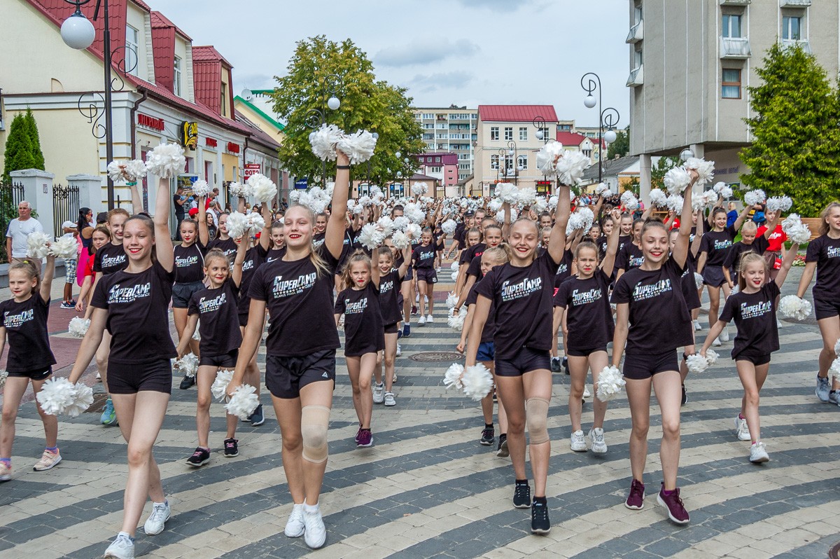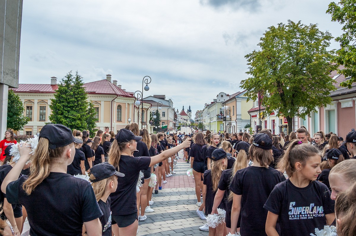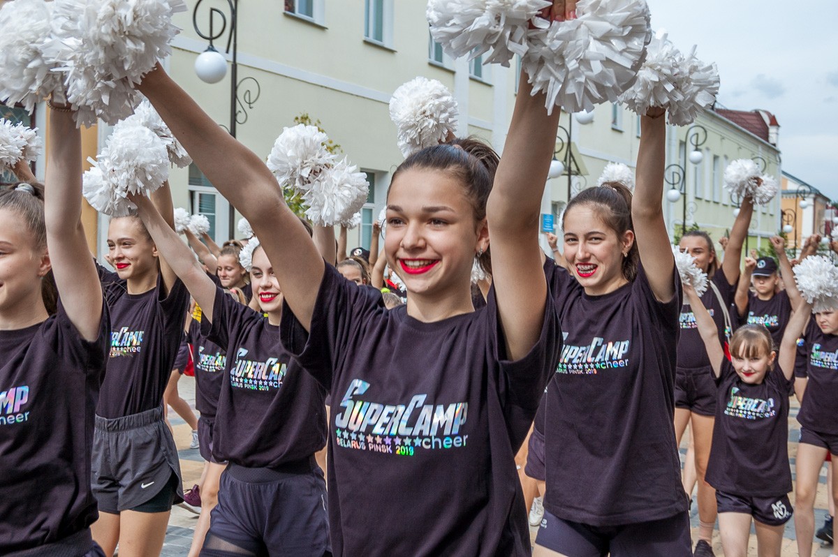Выстроившись в длинную колонну, чирлидеры под звуки Пинского городского оркестра духовой и эстрадной музыки маршем прошли по главной улице города до площади Ленина. Там началось самое интересное. Кроме танцев, были невероятные трюки с поддержкой, которые показывали чирлидеры.