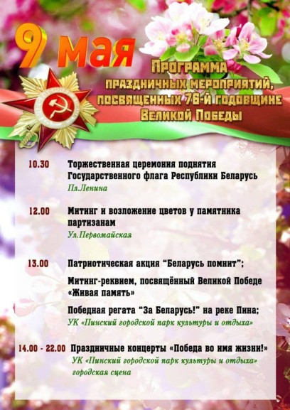 Сегодня в Беларуси празднуют День великой Победы. 76 лет назад закончилась Великая Отечественная война. В память об этом важном не только для Беларуси дне 9 мая ежегодно празднуют День Победы и вспоминают жертв этой катастрофы. Не остался в стороне и Пинск. Люди выходят в город с самого утра. Этому способствует и по-настоящему жаркая погода. Кажется, что сама природа радуется празднику, и подарила пинчанам тепло после столь продолжительного холода. Прошел даже парад, который и не был запланирован.