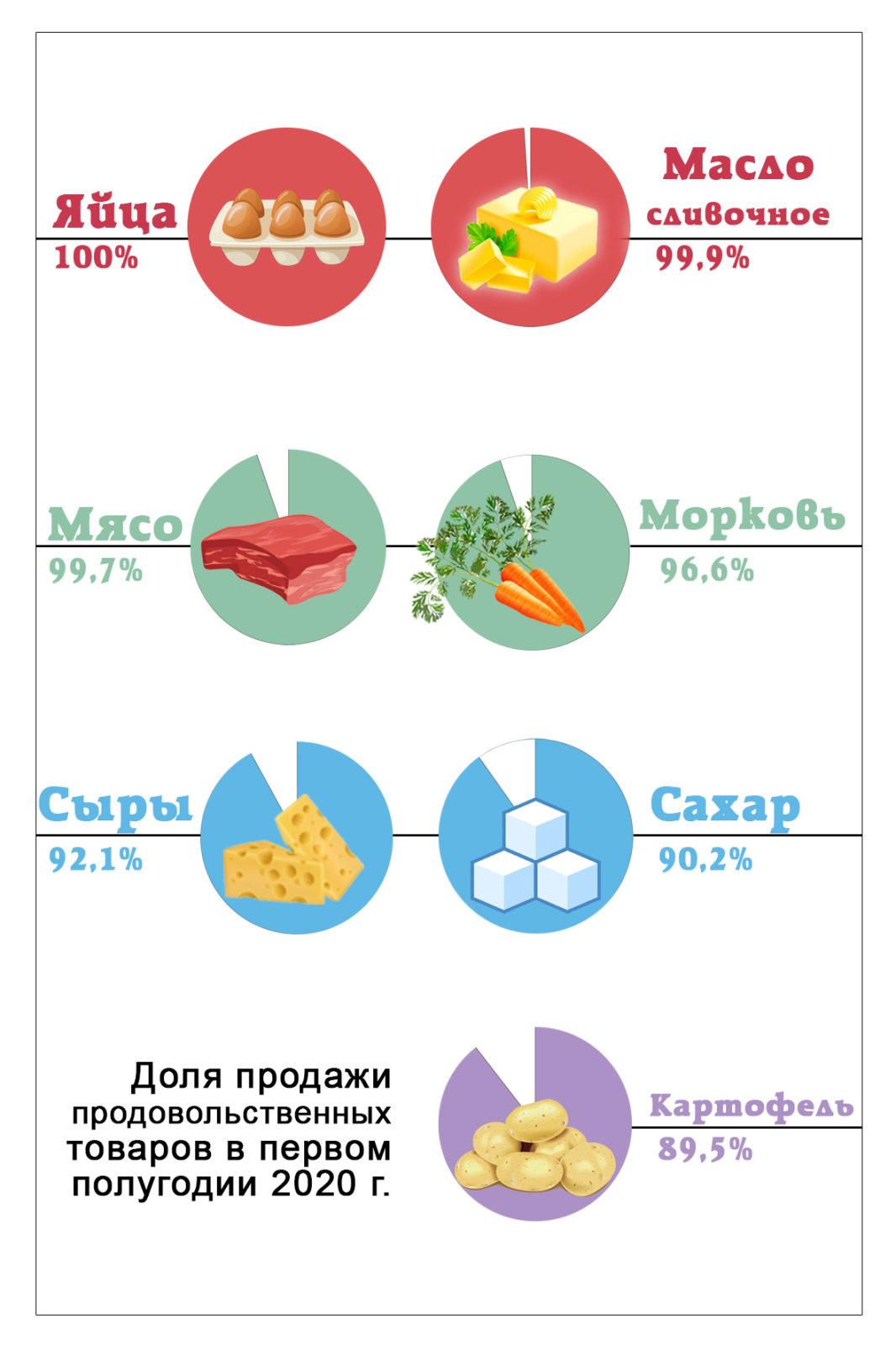 Доля продажи отдельных продовольственных товаров отечественного производства в общем объеме продажи организаций торговли в первом полугодии 2020 г. (в процентах):