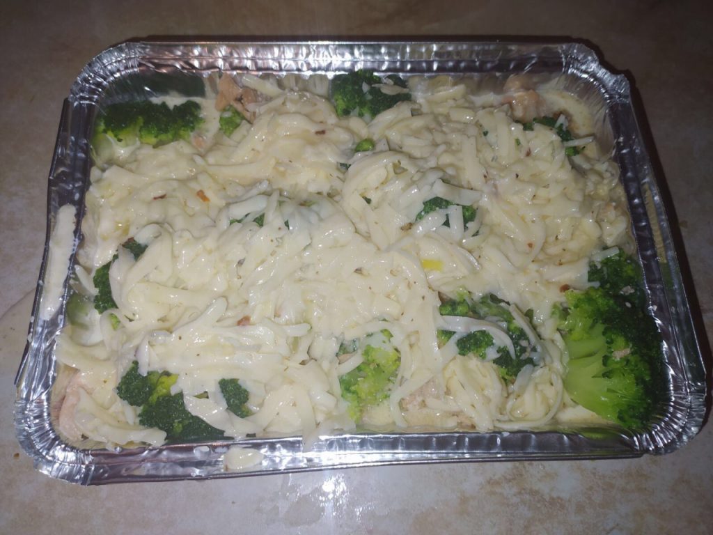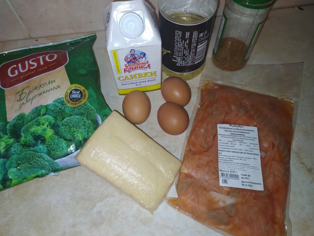 – Брокколи и филе лосося выкладываем в форму для запекания. Заливаем их составом из сливок, яиц и сыра.