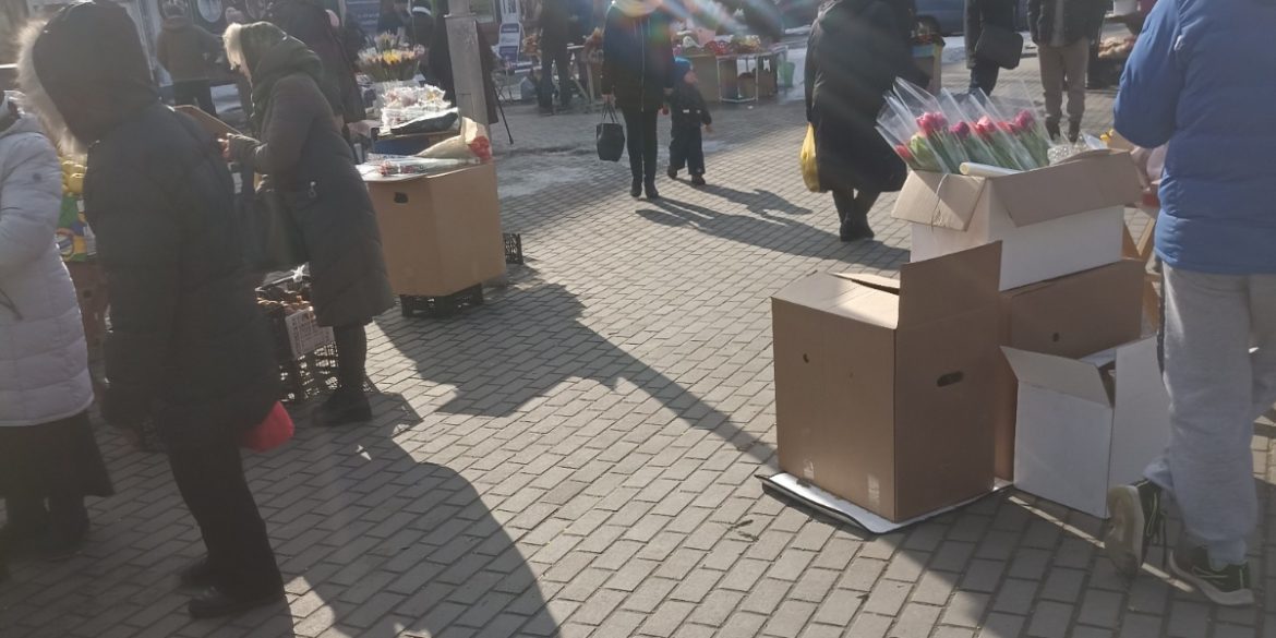 «Это три тюльпана. А так бутоном тюльпан — 3 рубля», — говорит одна из девушек, которая первый день торгует цветами.