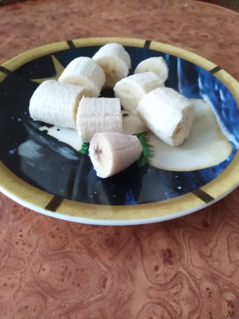 Очистите банан от кожуры и разрежьте его на небольшие кусочки. Желательно, чтобы фрукт был спелым для лучших вкусовых качеств.