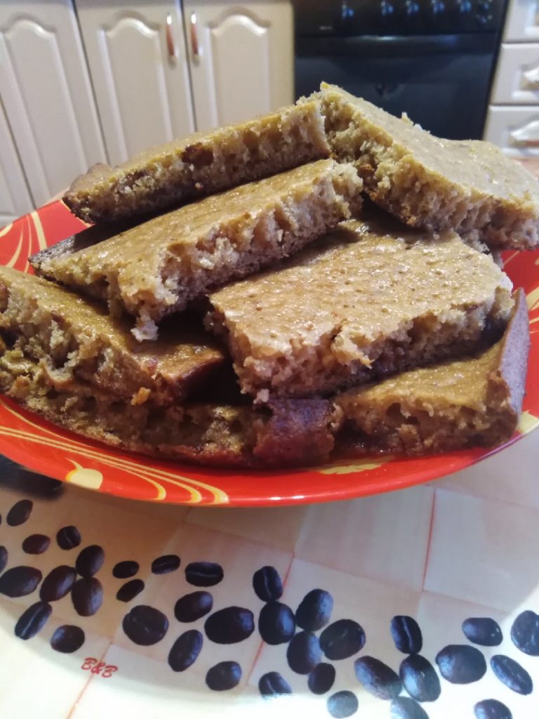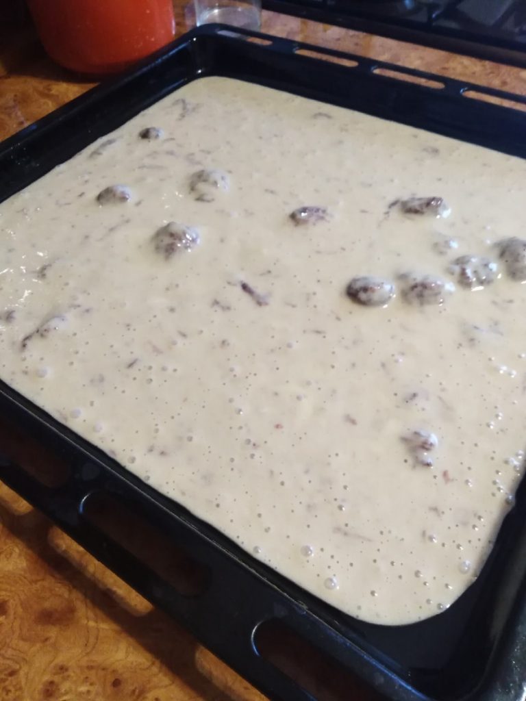 - Нагреть духовку до 180 градусов и вылить всю получившуюся смесь на противень, смазанный предварительно подсолнечным маслом. Выпекать около 20 минут, готовность проверить зубочисткой. Приятного аппетита!