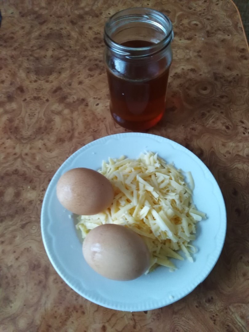 — через 2 минуты на одну половину омлета выкладываем сыр и мёд.