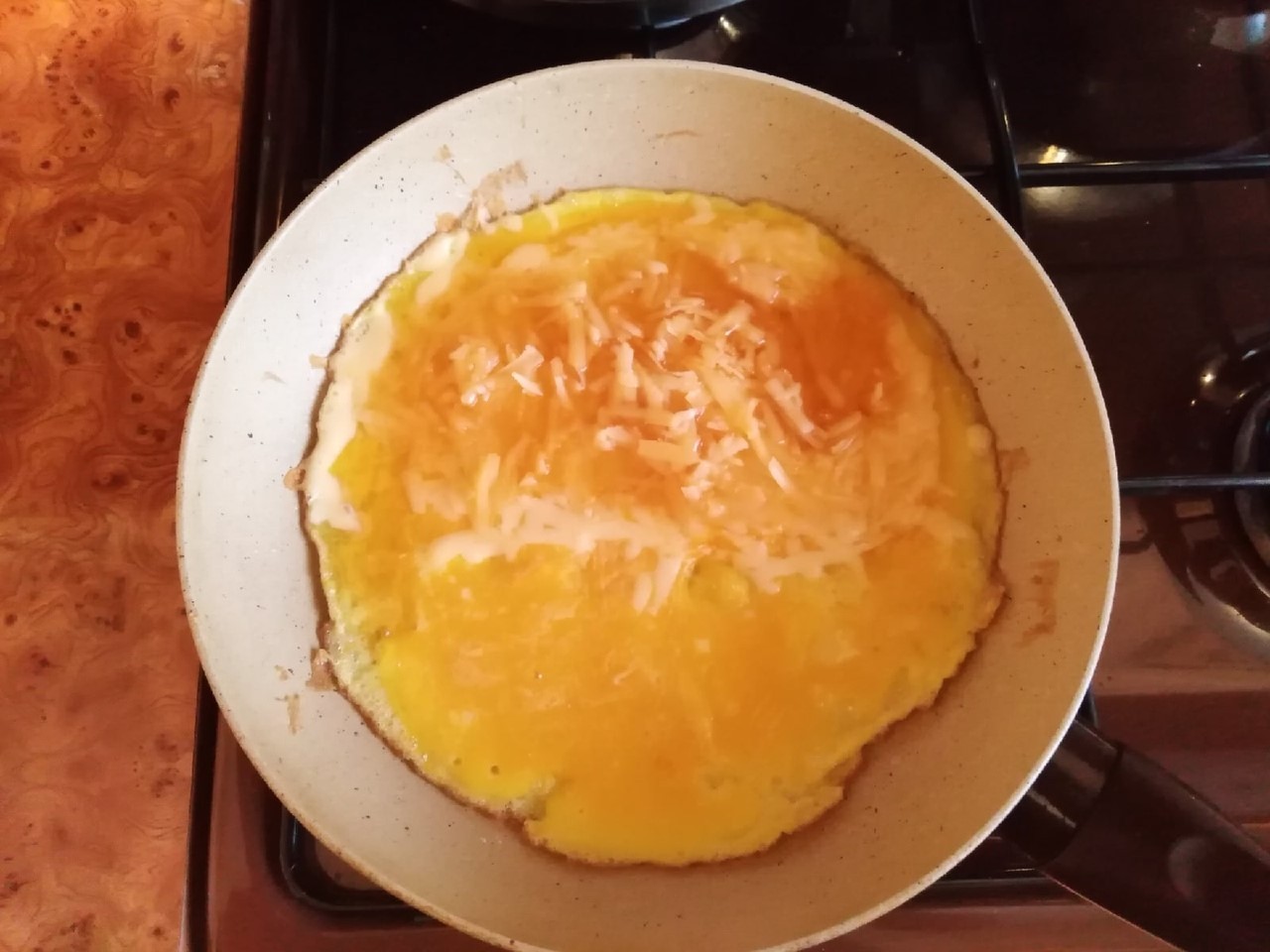 — до однородной массы взбиваем яйца. Далее выливаем в разогретую и смазанную маслом сковороду так, чтобы яйца покрывали всё дно.