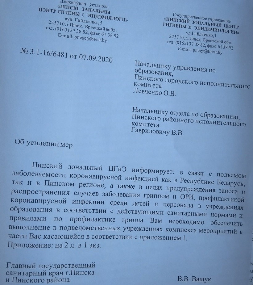 Это свидетельствует из письма главного санитарного врача Пинского района Владимира Ващука отделы по образованию Пинского района.