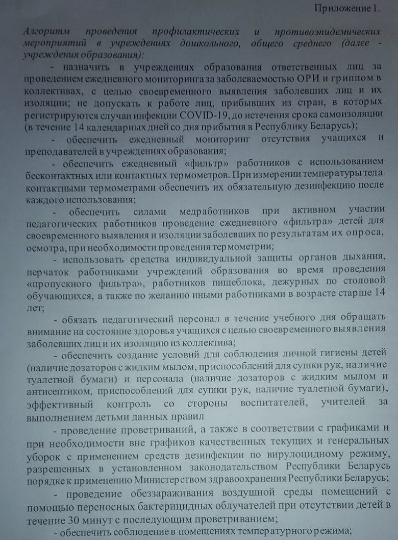 «Пинский зональный ЦГиЭ информирует: в связи с подъёмом заболеваемости коронавирусной инфекцией как в Республике Беларусь, так и в Пинском регионе, а также в целях предупреждения заноса и распространения случаев заболевания гриппом и ОРИ, профилактикой коронавирусной инфекции среди детей и персонала в учреждениях образования в соответствии с действующими санитарными нормами и правилами по профилактике гриппа Вам необходимо обеспечить выполнение в подведомственных учреждениях комплекса мероприятий в части Вас касающейся в соответствии с приложением 1».