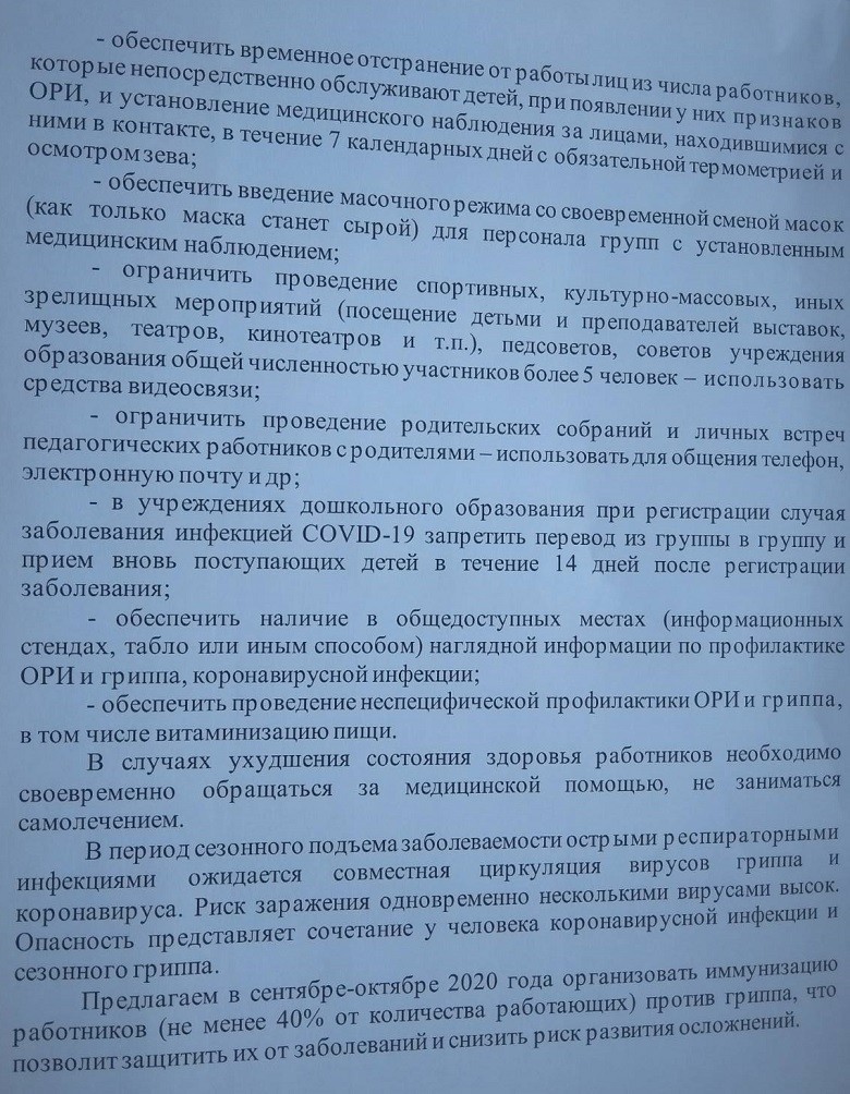 Письмо было разослано по школам и дошкольным учреждениям, в нем оговаривается, какие меры нужно принять им в профилактике коронавируса.