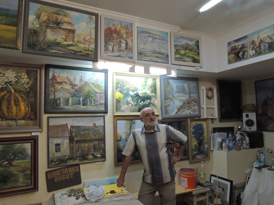 Всё пространство мастерской художника увешано, заставлено полотнами, работами, набросками.