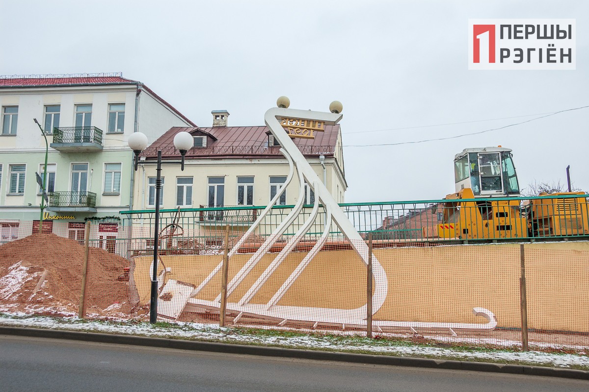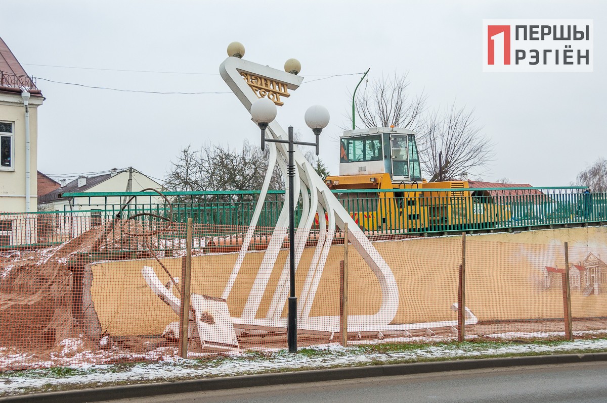 Не нужно иметь хорошее зрение, чтобы не заметить, что так называемая композиция «Ладья» уже снята и стоит в стороне. Она, согласно проекту, будет перенесена на противоположный берег реки в составе въездной группы в город со стороны г.Столина.