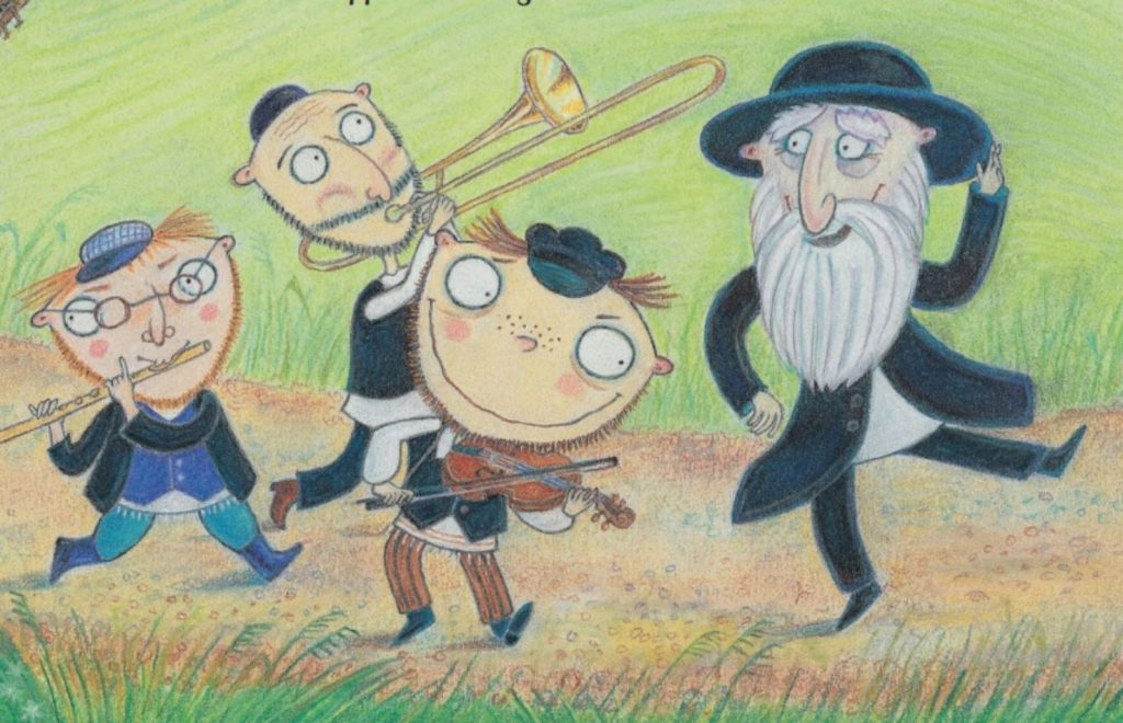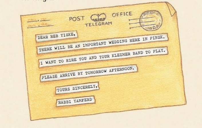 «Дорогой Реб Йиске, Здесь, в Пинске, будет важная свадьба. Я хочу нанять тебя и твою клезмерскую группу для игры. Пожалуйста, приезжайте завтра днем. Искренне Ваш, Раввин Ямферд!».