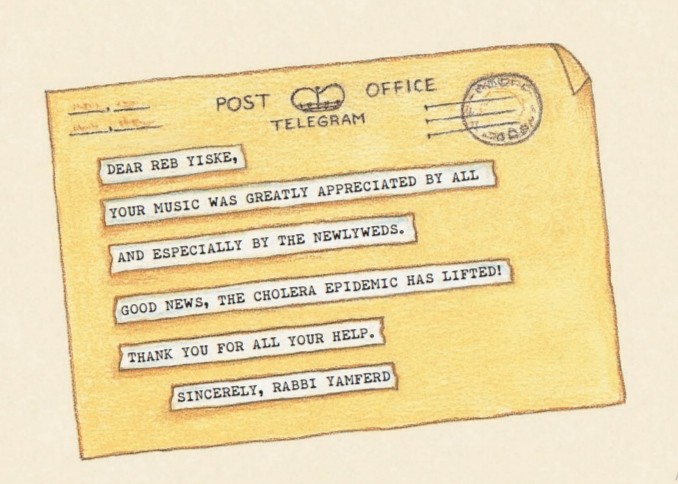 «Дорогой Реб Йиске, Вашу музыку высоко оценили все гости и особенно молодожены. Пишу с хорошими новостями, эпидемия холеры прекратилась! Спасибо тебе за помощь. С уважением, раввин Ямферд!» — говорилось в письме.