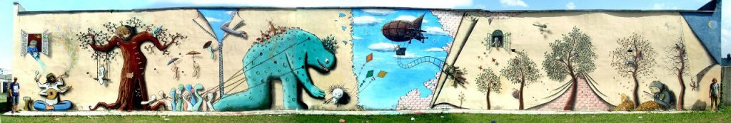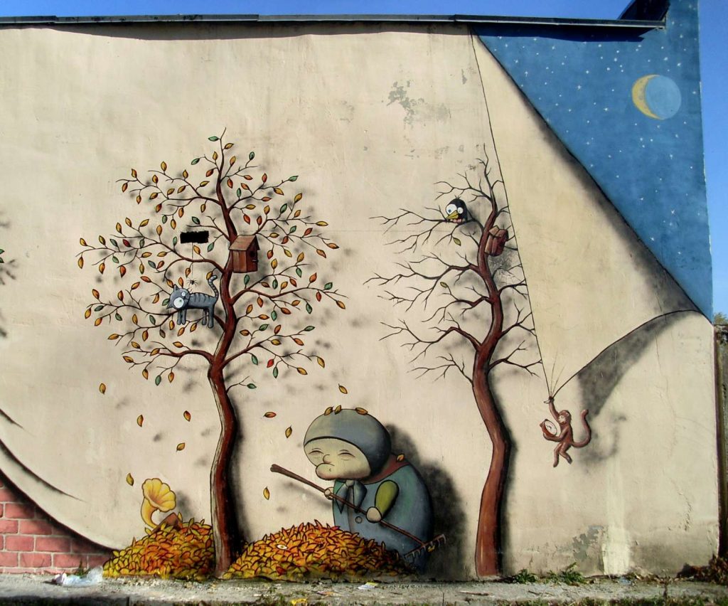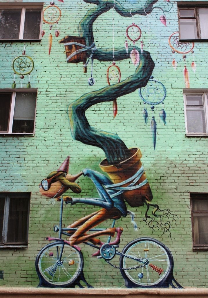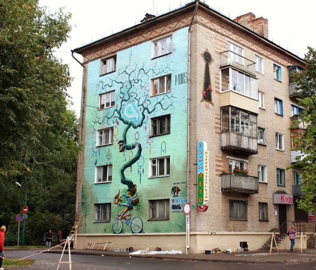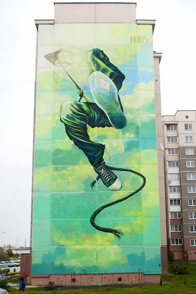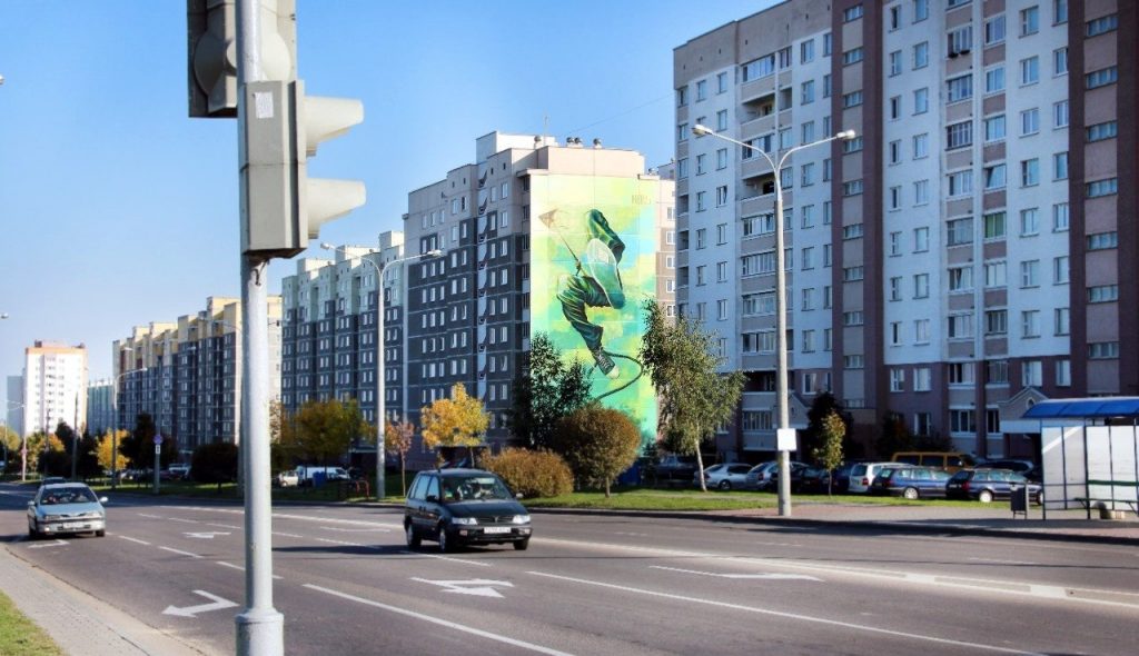 Фасад высотки по улице Белые Росы в Гродно теперь украшает, делает оригинальным и приметным изображение человека, которого уносит над землёй воздушный змей. На фон картины ушло 75 л акриловой краски, а на само изображение 30 баллонов аэрозоля.