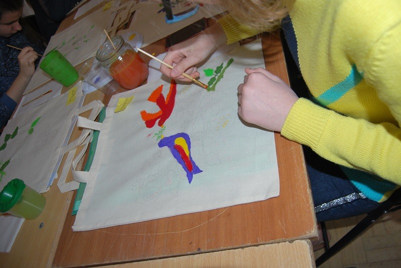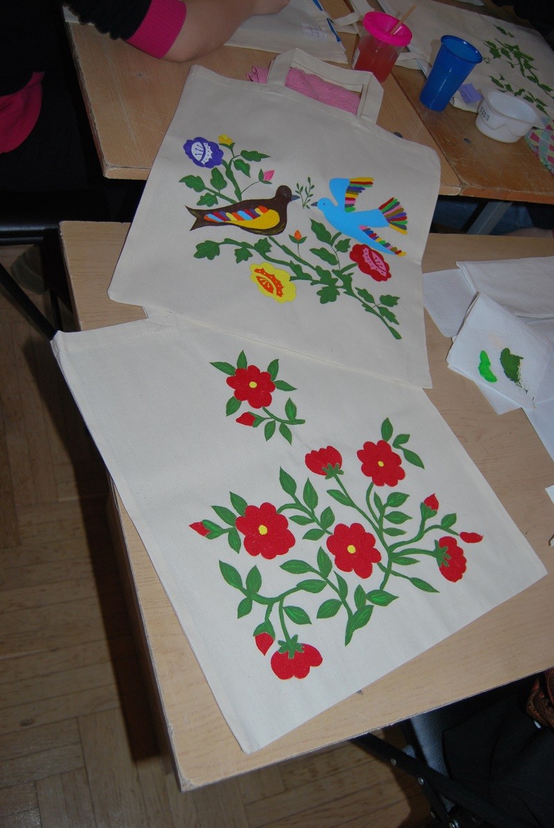 Перед открытием выставки Алина Дембовска поделилась опытом работы своего музея. Она организовала для всех желающих мастер-класс по рисованию на полотняных сумках узоров народных рушников.