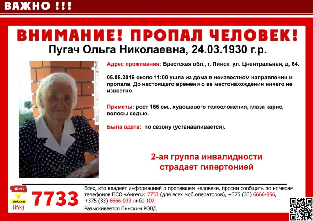 89-летняя Пугач Ольга Николаевна, которая проживает в Пинске по адресу: ул. Центральная, д. 64, 5 августа примерно в 11 утра ушла из дома в неизвестном направлении. До настоящего времени о ее местонахождении ничего не известно.