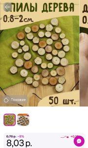 За 50 штук в упаковке установлена цена 8,03 рубля. В наборе 9 разных пород дерева: дуб, верба, липа, берёза, клён, ясень, лещина, ель, ольха. Спилы нешлифованные. Толщина 0,5 см. Спилы упакованы в пакет россыпью, порода дерева не подписана. Количество той или иной породы в наборе не одинаковое.