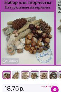 Шишки, каштаны, кора, жёлуди и прочее – всё идёт без обработки в наборе. Около 40 предметов стоит 18,72 рубля.