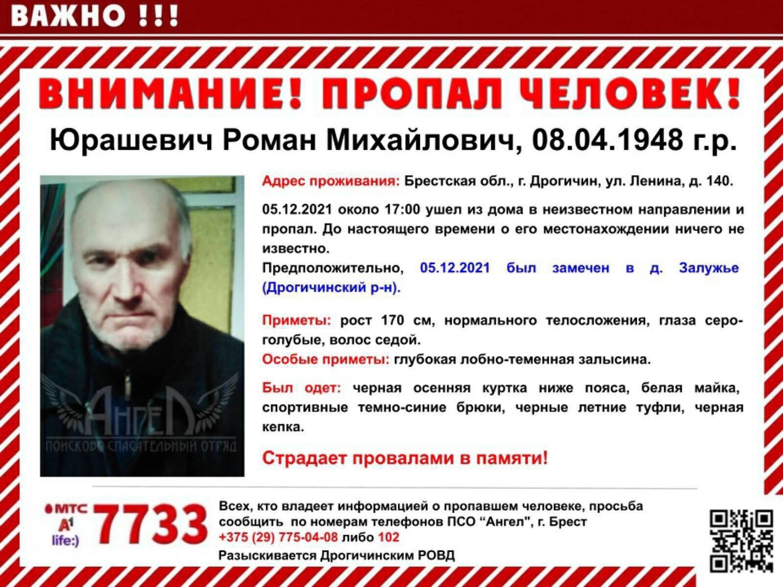 «Внимание! В связи с тем что не растаял выпавших снег, поиски Юрашевича Р.М. 08 января ОТМЕНЯЮТСЯ! Спасибо всем кто откликнулся!»