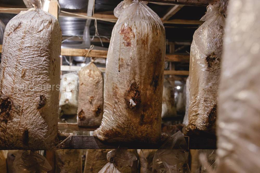 Сейчас вы видите белые мешки оброщенные, но в начале это обычная мешковина, темная. Белыми становятся, когда мицелий обрастает и захватывает весь блок, то есть это его среда, где потом появляются маленькие грибочки.